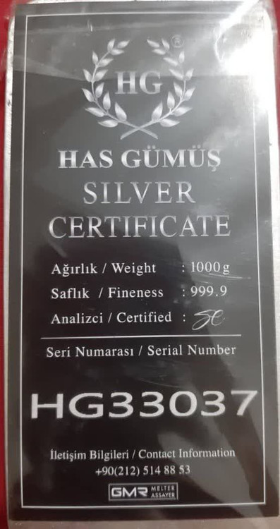 شمش نقره 999/9یک کیلویی1000گرمی برندهاس گوموش ترکیه ضمانت اصل همراه سرتیفیکیت